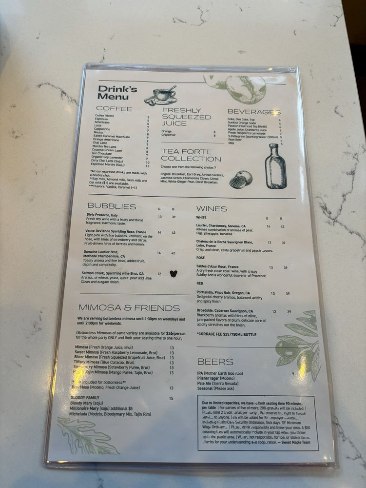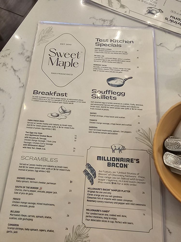 Sweet Maple is a bustling American breakfast and brunch spot located in San Francisco. With a diverse menu that includes unique dishes like Millionaire's Bacon and innovative creations like the SM Omurice, Sweet Maple offers a delightful culinary experience. Customers rave about the friendly service, creative menu options, and generous portion sizes. The restaurant caters to various dietary needs with vegan and limited vegetarian options available. The cozy interior design and quick service make dining at Sweet Maple a pleasant experience. Don't miss out on trying the mouthwatering menu items like the BLTA Breakfast Sandwich or the Ramen Breakfast Dish. Sweet Maple is a must-visit for a satisfying and flavorful breakfast or brunch in the Bay Area.